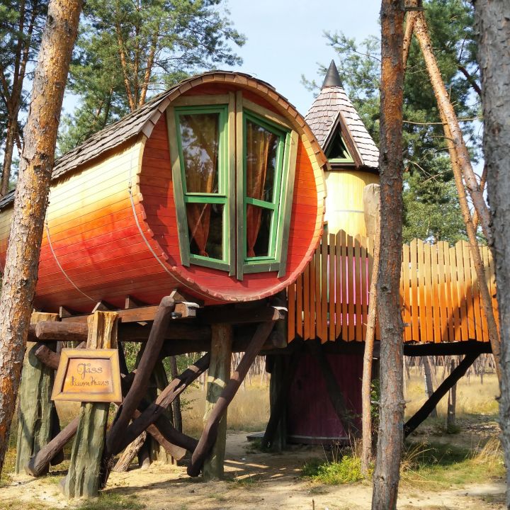 / Kulturinsel Einsiedel / Kulturinsel Einsiedel - Part of the treehouse hotel, complete with exit slide.